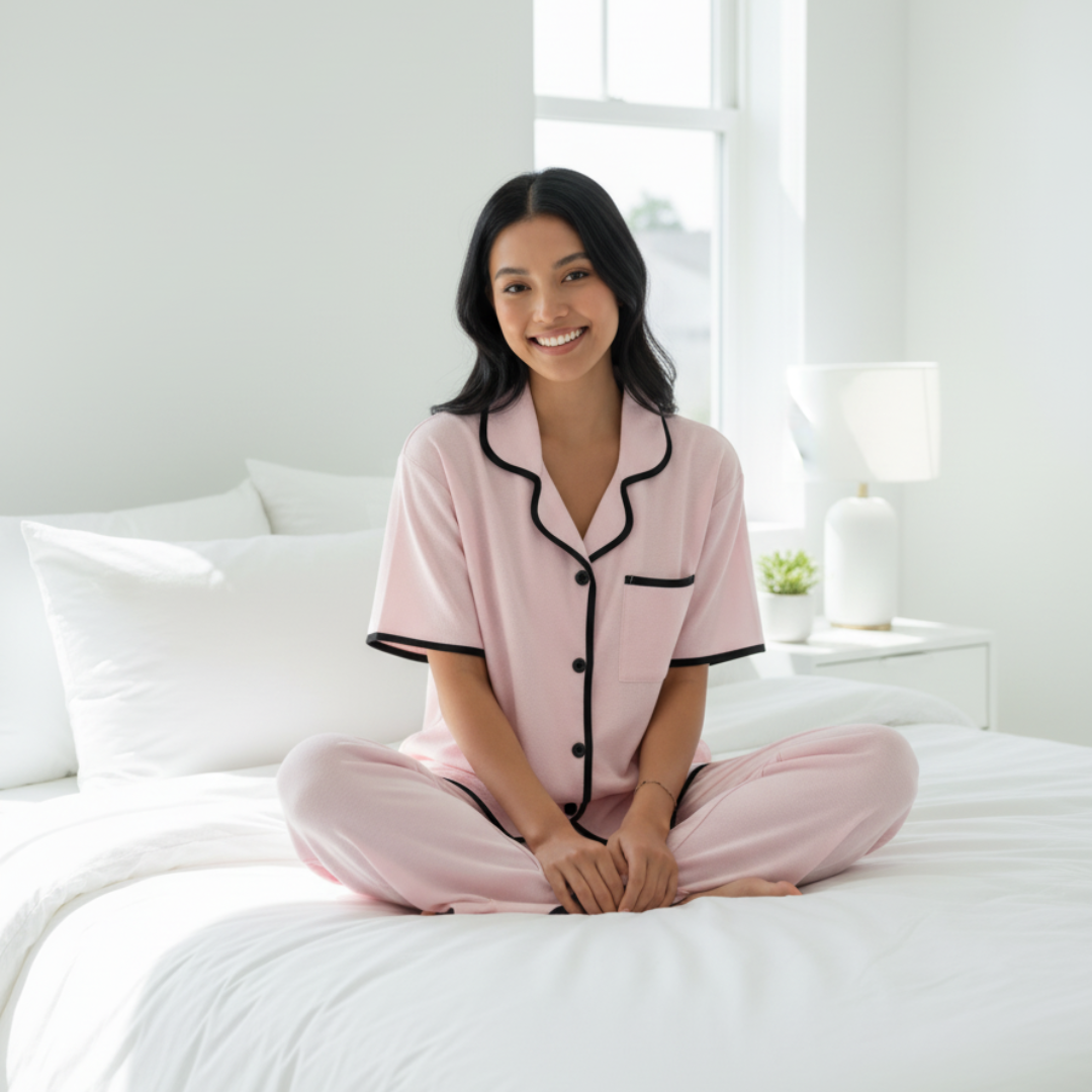 Crafted from buttery soft, breathable fabric, this set feels gentle against the skin while giving you freedom to move. The delicate blush tone is beautifully contrasted with sleek black piping, offering a chic finish. Whether for restful sleep or cozy days at home, this pajama set ensures all-day comfort with a polished look.