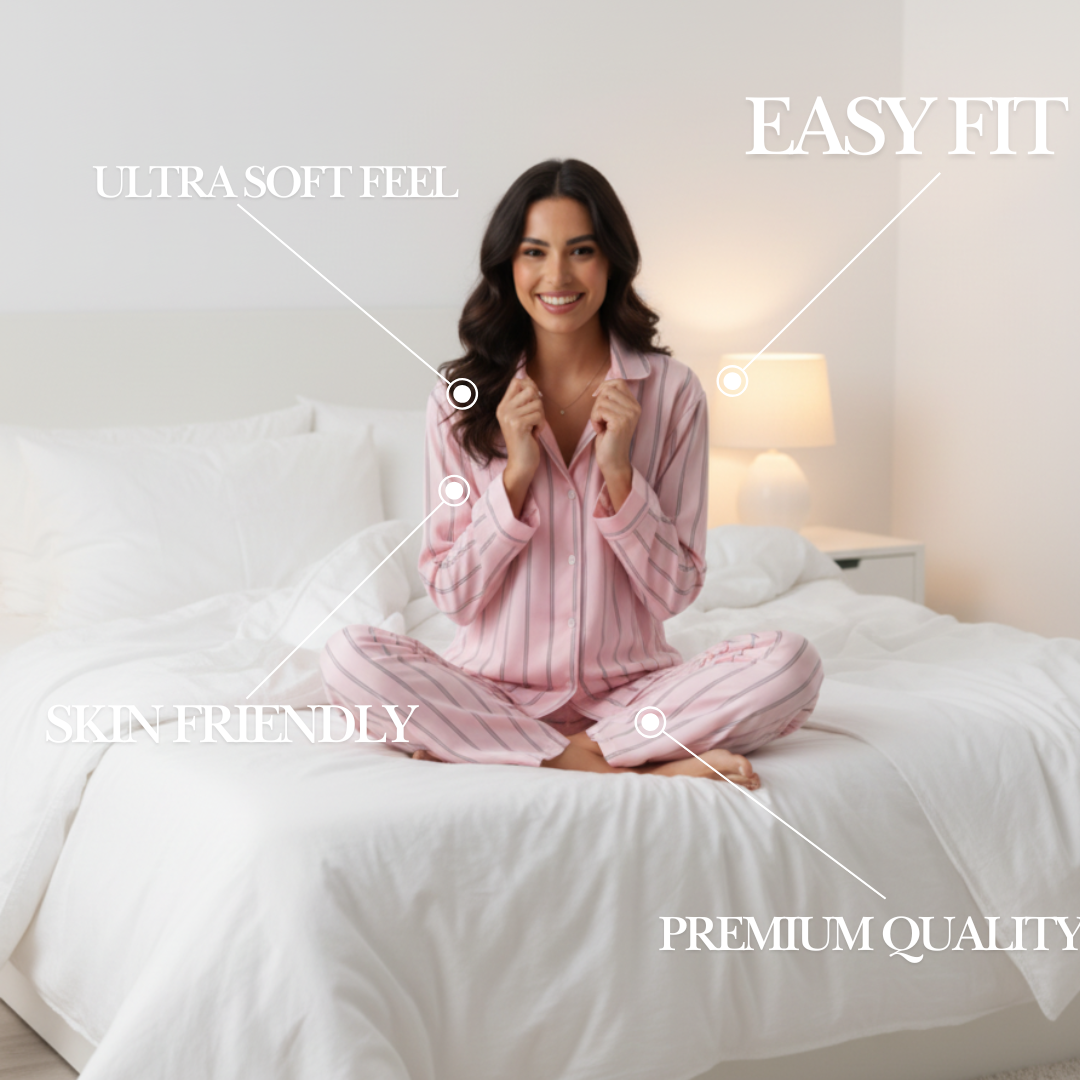 Women’s Long Pajama Set – Pink Striped Sleepwear with Button-Up Top & Pants